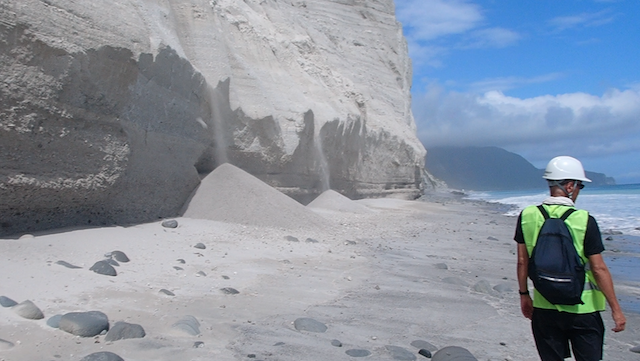 崖は、岩の崖ではなく、砂や礫(れき、小石や砂利)が堆積してできた地層が重なった地盤です。